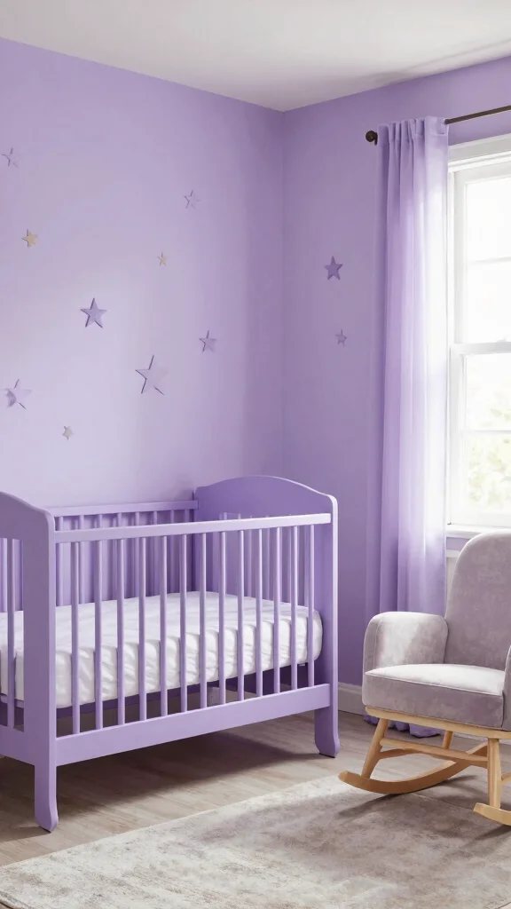 Gentle lavender is a dreamy color for a nursery, known for its calming and soothing properties. This tranquil shade helps create a peaceful space ideal for winding down after busy days. When paired with white or light grey furniture, lavender walls maintain a bright and airy atmosphere. Whimsical touches like star-shaped wall decals or fluffy plush toys can further enhance the cozy environment.
