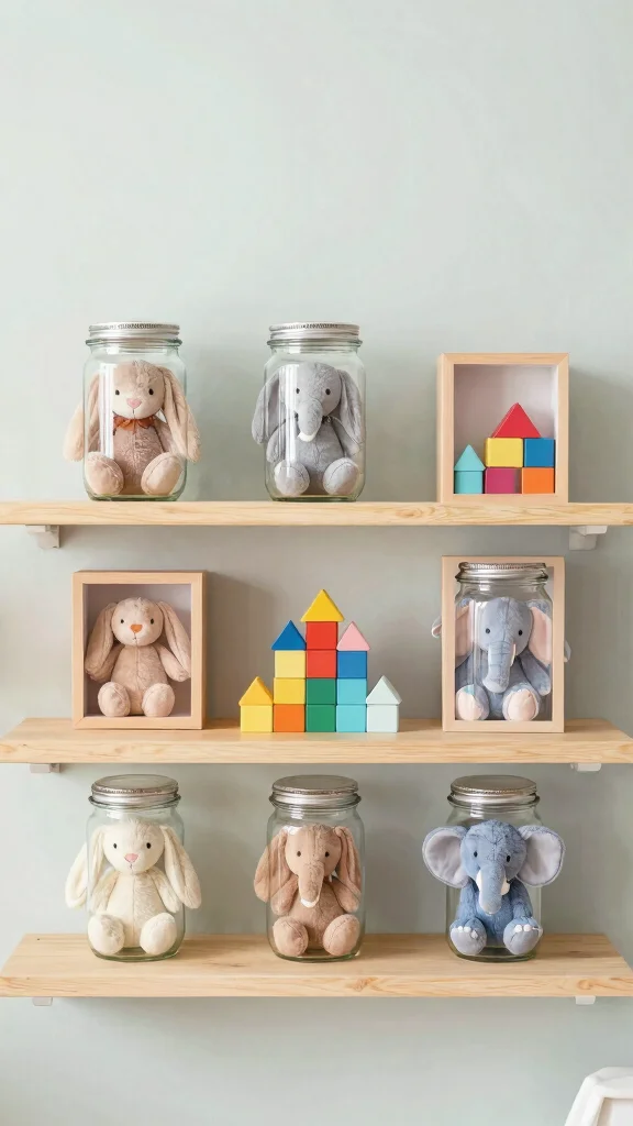 To bring a playful spirit to your nursery, consider displaying toys in imaginative ways. Using shadow boxes or clear jars allows plush animals and vibrant building blocks to become part of the decor. This method not only organizes but also transforms toys into delightful displays. Picture a charming collection of stuffed animals resting in a rustic wooden box, creating a tidy yet whimsical atmosphere.