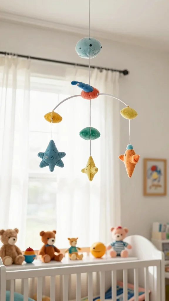 Select mobile designs that align with the nursery’s theme, whether featuring dreamy clouds or colorful animals. Position them at a height that’s easily visible to your baby, and incorporate a mix of colors and shapes for visual stimulation.