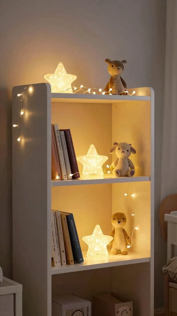 Fun fact: 3 easy lighting patterns—dots, waves, and halos—on nursery shelves can elevate nursery shelf decor ideas, making night feeds feel magical and calmer. Use battery-operated fairy lights for safety, then arrange them in playful shapes that double as decor without obstructing items.