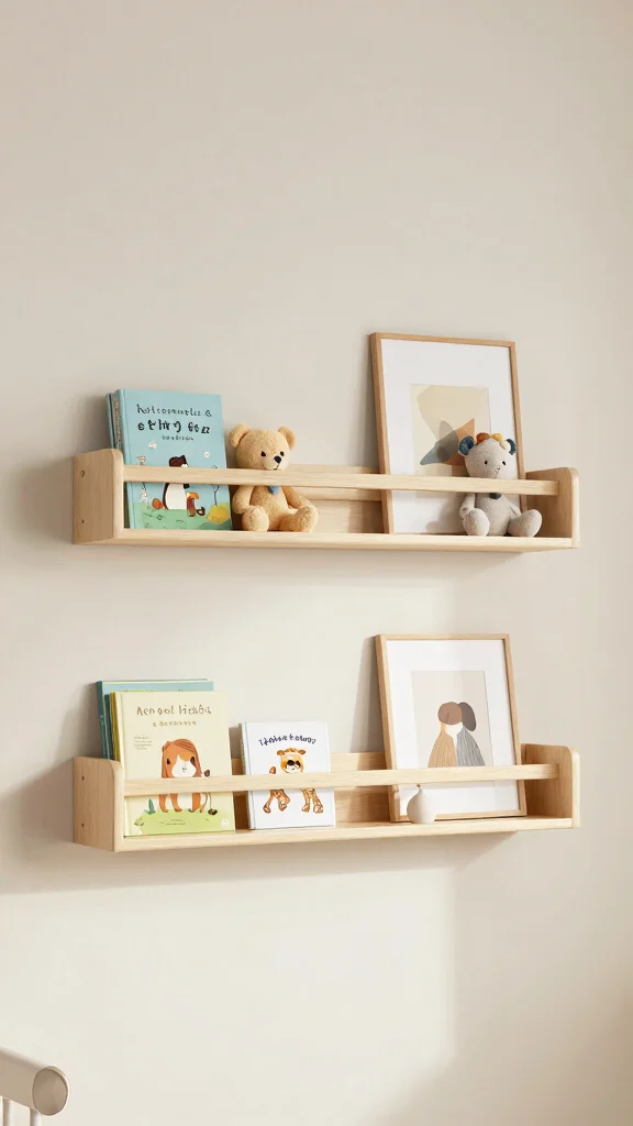 Floating shelves embody the essence of minimalism, offering sleek storage solutions that won’t clutter your nursery. Install them at different heights to display curated toys, books, or framed artwork. This straightforward design keeps the space feeling airy and open, perfect for a calming atmosphere.