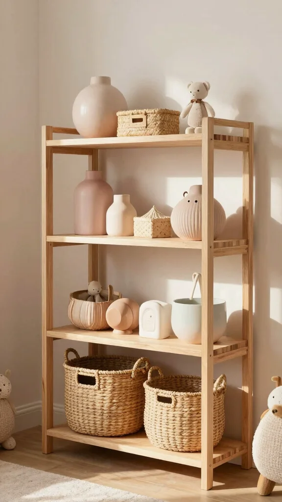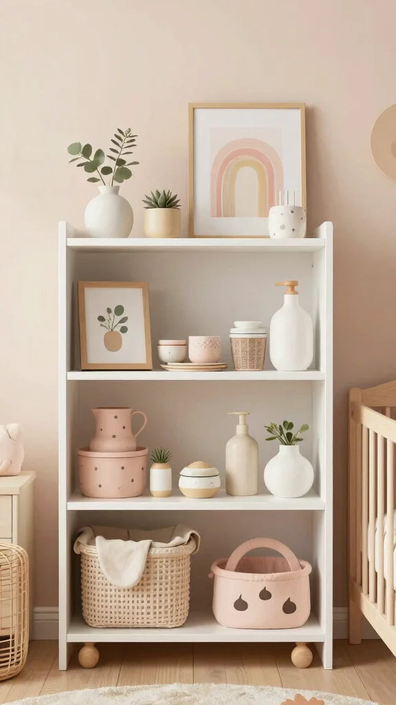 This method not only keeps your nursery organized but also highlights your favorite decor, creating a beautiful and serene space.