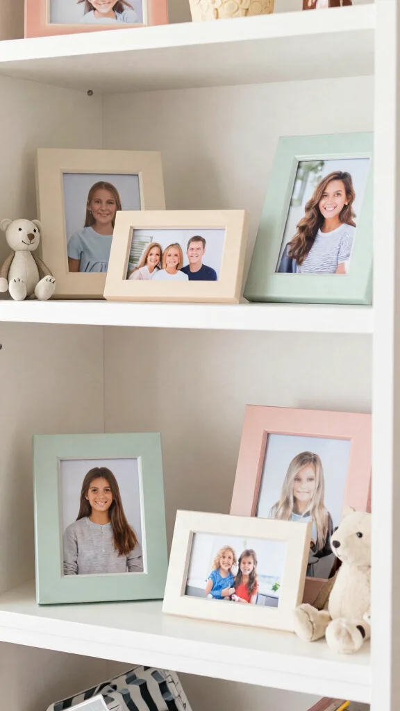 Aiming for a mix of frame sizes can add an engaging layout. Opt for soft-colored frames that align with your nursery’s theme, and position photos at different heights to create depth.