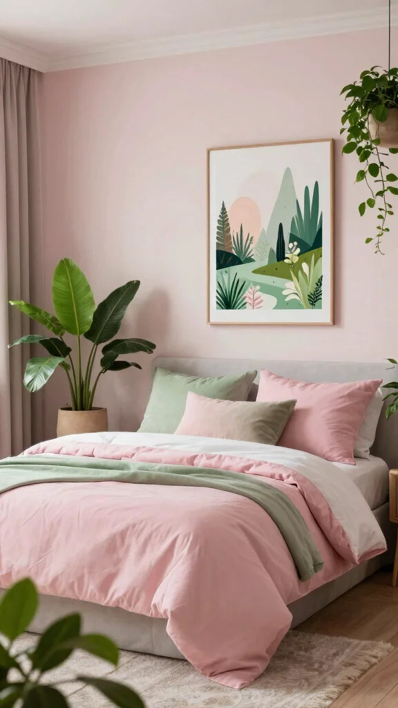 To achieve this look, consider using deep green plants alongside soft pink textiles for a cohesive feel. You could also choose pink fabrics that include hints of green, or feature nature-themed prints for wall art. This harmonious combination uplifts the room’s aesthetic, promoting a calming environment for relaxation.