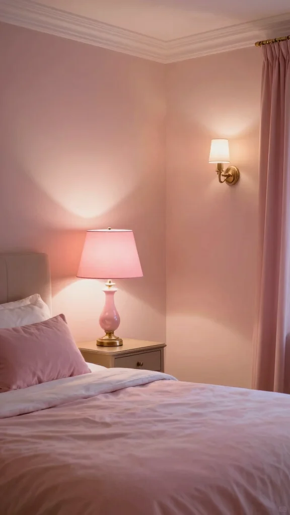 Lighting can make or break the look in a pink guest bedroom ideas. Start with warm, dimmable overhead lighting and add layers: a soft table lamp, a floor lamp, and string lights for a dreamy touch.
