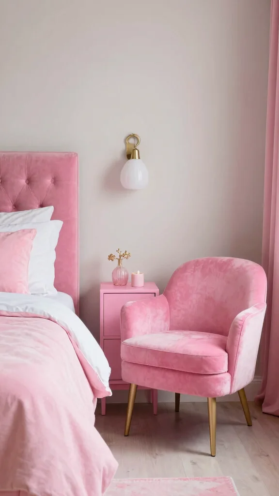 To implement this concept effectively, choose a pink chair or nightstand that showcases your unique style. Pairing bold pink pieces with simple decor can help maintain balance and prevent the space from feeling overwhelming. This playful yet elegant design creates a memorable experience for guests.