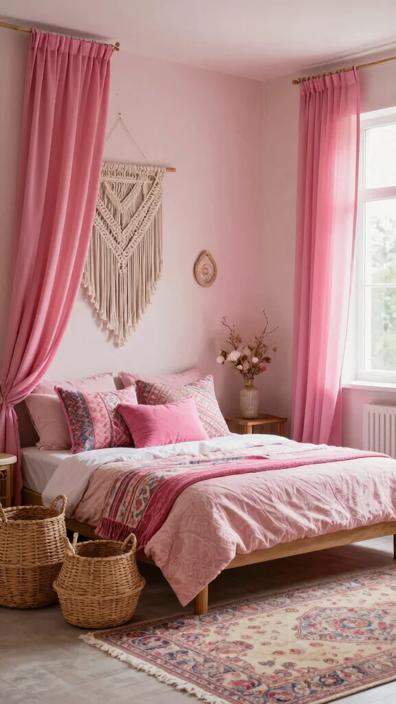 Embrace bohemian vibes by layering various pink textures and patterns for a cozy, inviting guest bedroom. This style thrives on eclectic elements, like oversized floor cushions and macramé wall hangings, which create a lively atmosphere. Picture bright pink curtains cascading down, adding a cheerful touch to the room.