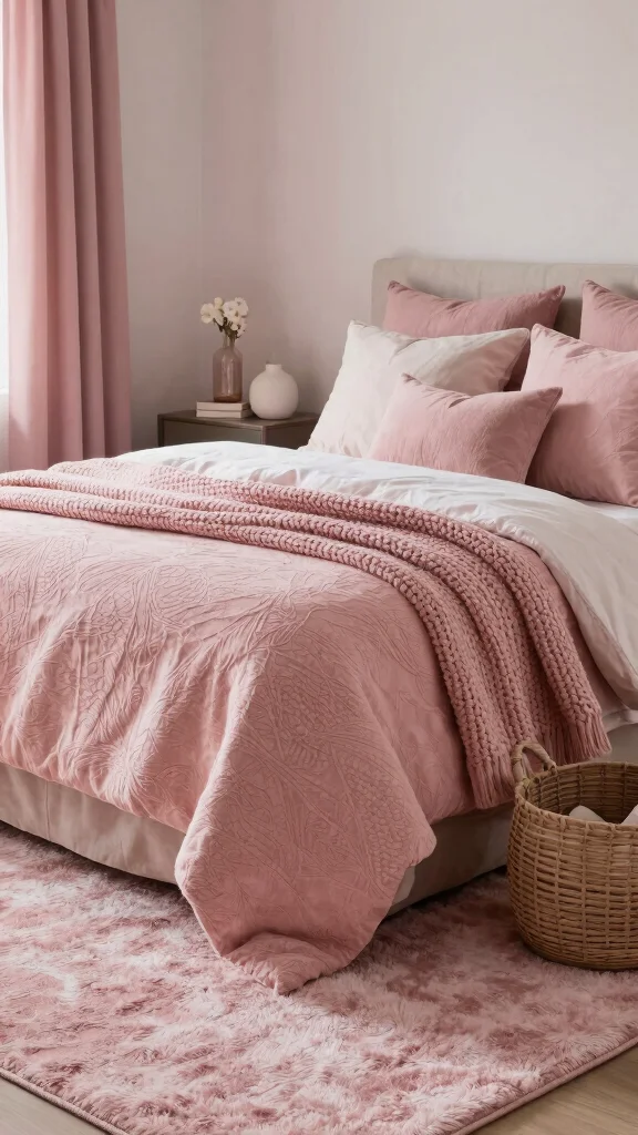 To achieve this look on a budget, combine different materials like cotton, velvet, and wool in various shades of pink. Consider using a plush area rug to anchor the space while decorative baskets can provide convenient storage for extra blankets or pillows. This tactile quality enhances comfort and invites guests to unwind.