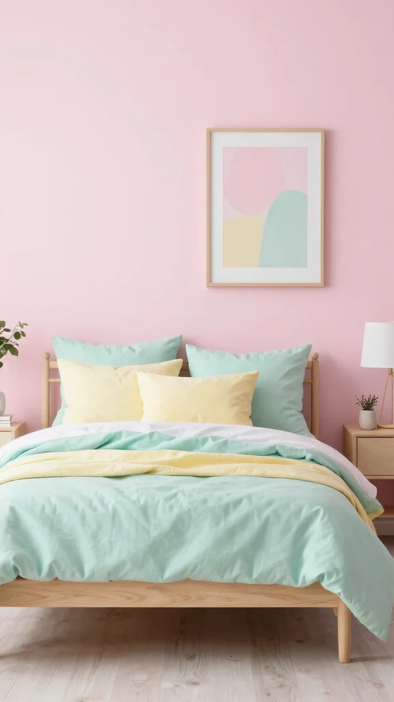 Soft pastel pinks combined with other gentle hues create a dreamy atmosphere ideal for a peaceful guest bedroom. This palette evokes a serene vibe, harmonizing pink with mint greens, soft yellows, or sky blues for a tranquil environment. Picture pastel pink walls set against softly colored furniture for a balanced look.