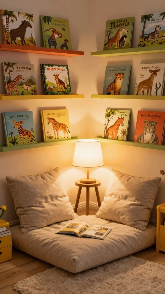 A reading nook encourages your child to explore their imagination through storytelling, making it a special retreat. Enhance the area with soft lighting or a small lamp for a warm atmosphere.