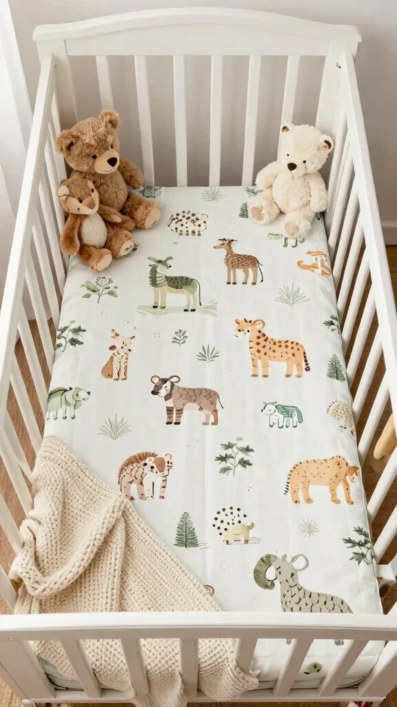Safari nursery ideas start with soft, eco-friendly bedding. Choose organic cotton sheets with playful animal prints, then layer a knitted blanket for extra warmth and texture—it’s comfy, safe, and easy to wash.