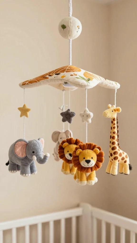 A delightful safari-themed mobile can be both decorative and calming for your baby. Hang a beautifully crafted mobile made from sustainable materials above the crib, featuring soft animals like lions, elephants, and giraffes. The gentle motion of the mobile captivates your little one’s attention while introducing them to the wonders of the animal kingdom.