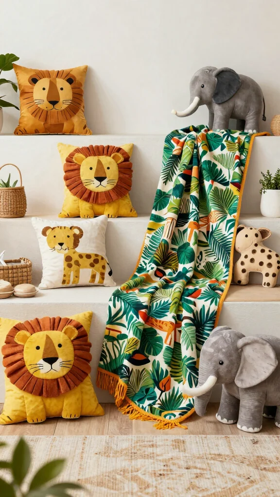 Add playful accents throughout the nursery to enhance the safari theme. From cushions shaped like animals to vibrant blankets adorned with jungle foliage, these details can significantly impact the overall feel. Fun animal-shaped pillows can serve as both decor and comfort for your baby.