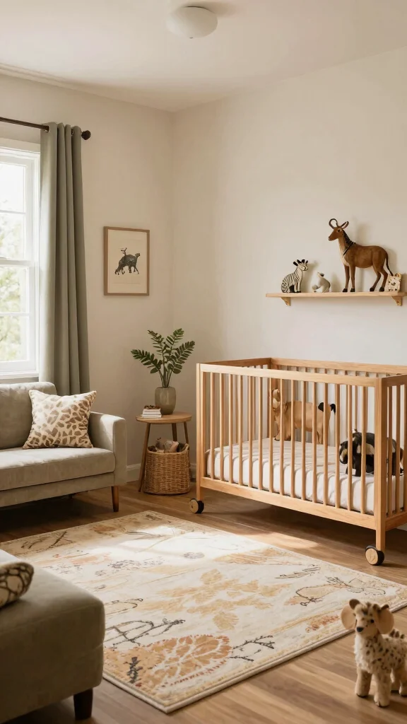 Curtains are essential for enhancing your nursery’s aesthetic while providing privacy and light control. Opt for curtains made from organic cotton or linen that aligns with the safari theme. Choose patterns inspired by nature—like leaves or animals—to maintain the theme and allow soft light to filter through, creating a serene ambiance.