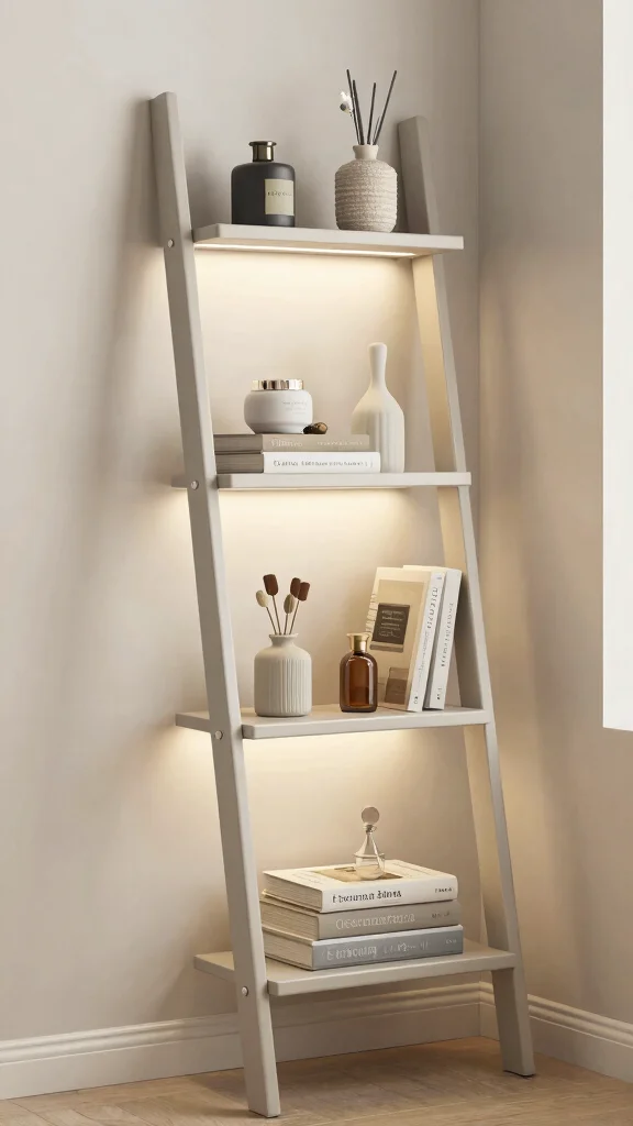 When positioning ladder shelves, consider placing them against a wall for a dramatic flair that enhances vertical space. Use the shelves to curate a personal collection that reflects your style, turning your dressing room into a personalized retreat. Ensure the design complements your existing furniture for a cohesive look.