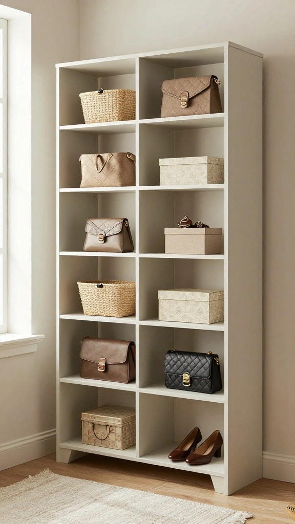 To implement built-in shelving, consider varying the heights to accommodate different items, from handbags to hats. Opt for decorative bins to keep everything tidy, and paint the shelves the same color as the wall to create a cohesive aesthetic. This method not only showcases your belongings but also aligns with minimalist design trends.