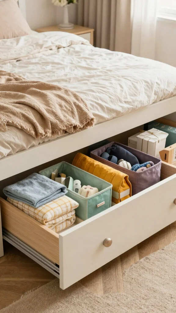 Harnessing the space under your bed can greatly improve small bedroom organization. Under-bed storage bins or drawers are perfect for stashing out-of-season clothing or shoes, keeping them accessible yet hidden. Picture a tidy space where everything has its place, contributing to a calm atmosphere.