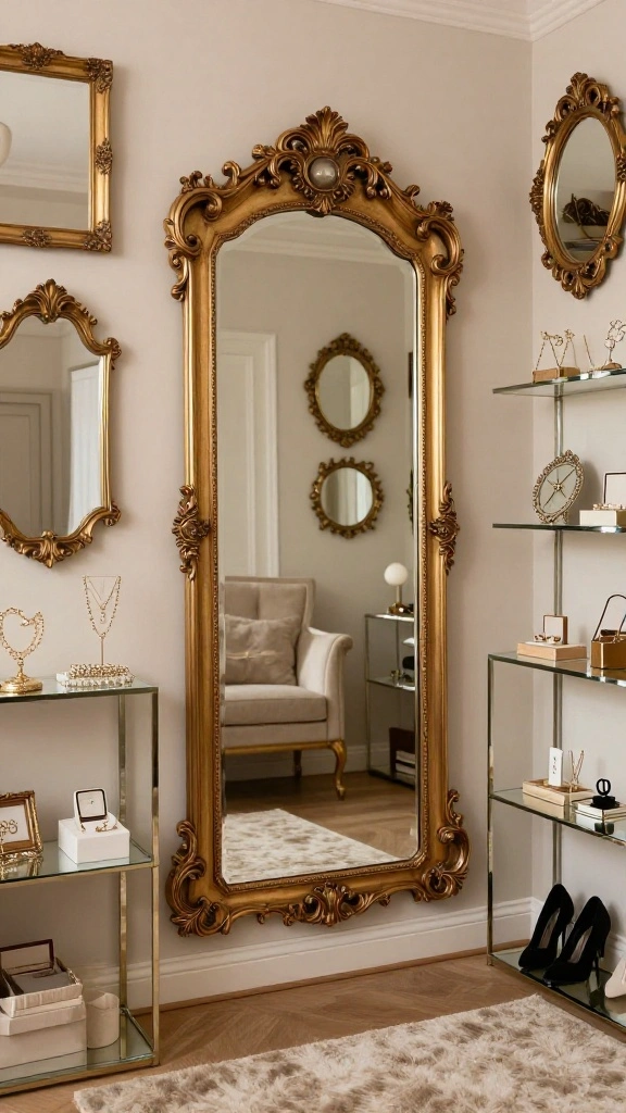 Mirrors are essential not only for outfit checks but also as striking design elements that can make your dressing room feel more expansive. Incorporating mirrored surfaces can reflect light and colors, adding depth and an air of sophistication to your space. A full-length mirror with an ornate frame can serve as a stunning focal point, while mirrored shelves keep the area organized and stylish. Ensure your mirrored pieces resonate with your overall decor style, whether it leans toward modern minimalism or vintage charm.