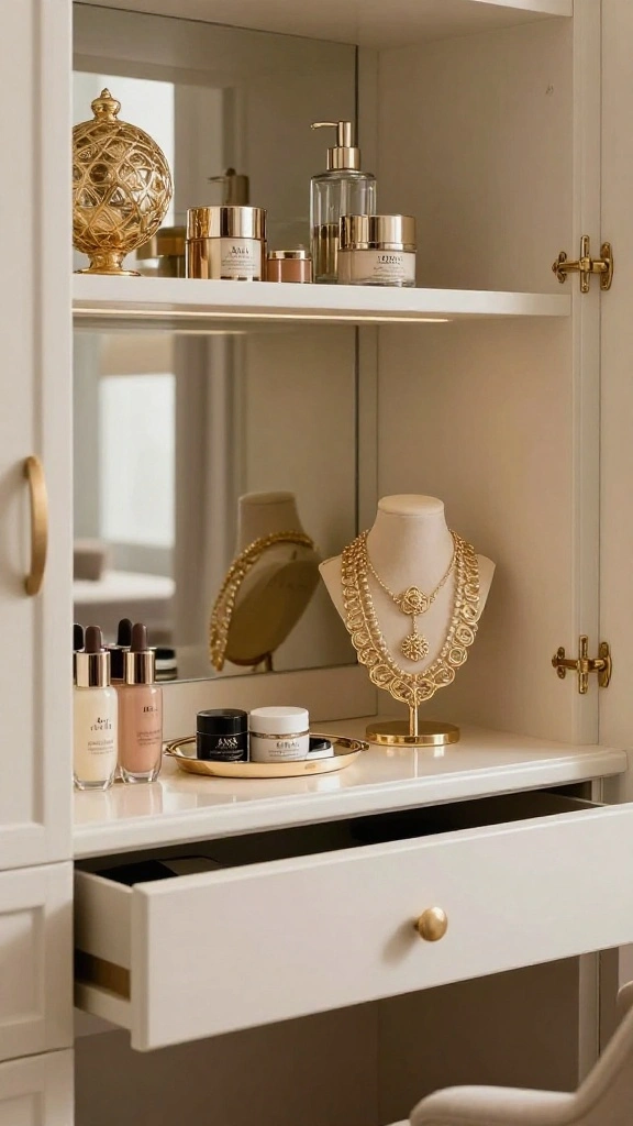 Use reflective surfaces and glass-front cabinets to maintain luxury while staying organized. For best results, follow dressing room design and interior styling tips to balance function and glam in a small space.