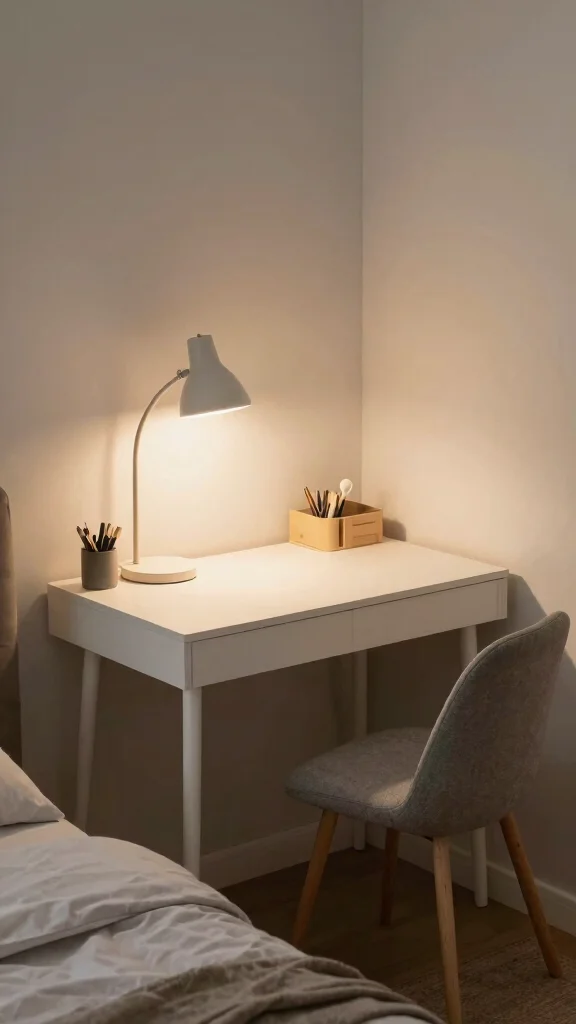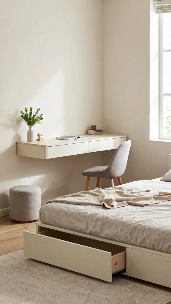 Use under-bed storage bins or drawers to hide essentials, and pick a compact desk that folds away when not in use.