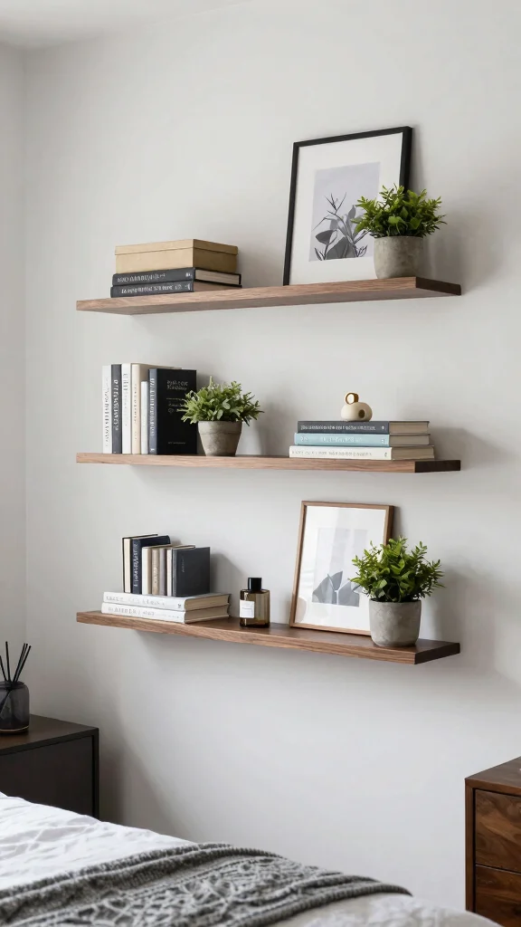 Wall-mounted shelves keep floor space open and add decorative storage.