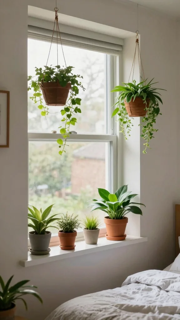 Consider placing small potted plants on windowsills or shelves, and use hanging planters to save floor space. Low-maintenance varieties like succulents or peace lilies are excellent choices for a touch of greenery.