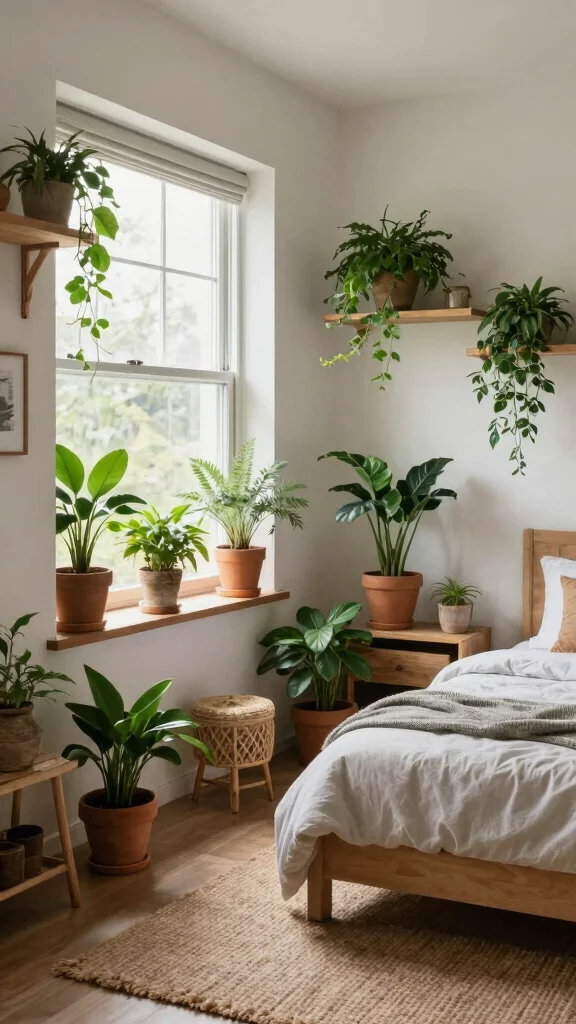Position plants on windowsills or use hanging pots to maximize vertical space. Additionally, incorporating natural materials like wood, rattan, and jute can enhance this earthy vibe. Some suggestions include: