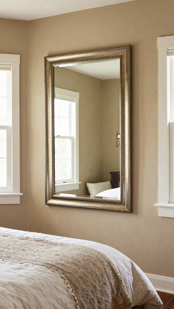 Consider positioning a large mirror above the bed or a stylish wall-mounted mirror to create an illusion of more space. A mirror with an attractive frame can also serve as a chic decor piece. Suggestions include: