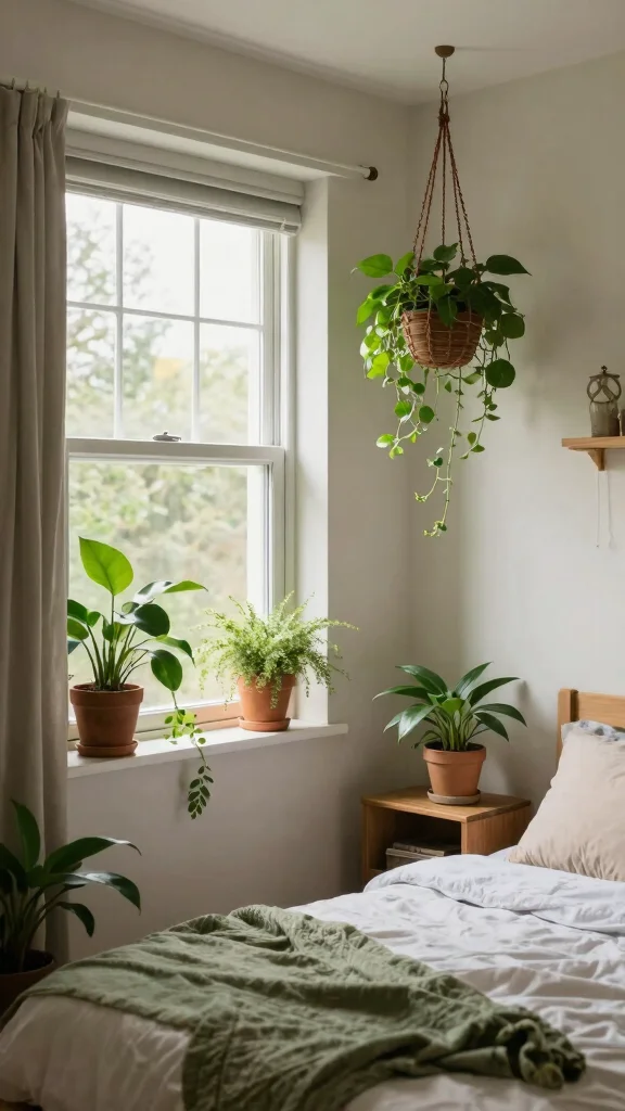 Fun fact: Greenery can make a small guest bedroom ideas layout feel brighter and more expansive. Low-maintenance plants like snake plants or pothos thrive indoors and keep surfaces free. Place a hanging planter by a window for instant charm and calm.