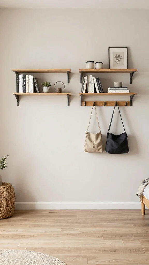 Utilizing wall space for storage can significantly enhance organization in a small guest bedroom. Wall-mounted shelves, pegboards, and hooks can display books, decorative items, or hold essentials like towels and robes, keeping the floor clear and the room feeling larger. Picture a beautifully arranged shelf with personal touches, making the space both functional and inviting.