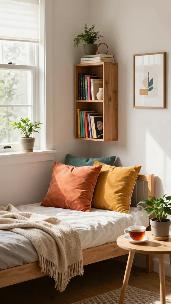 Enhance this nook with a small bookshelf and a side table for drinks or books, ensuring your guests have everything they need within reach. Consider thrift stores for unique finds that can add character to your space.
