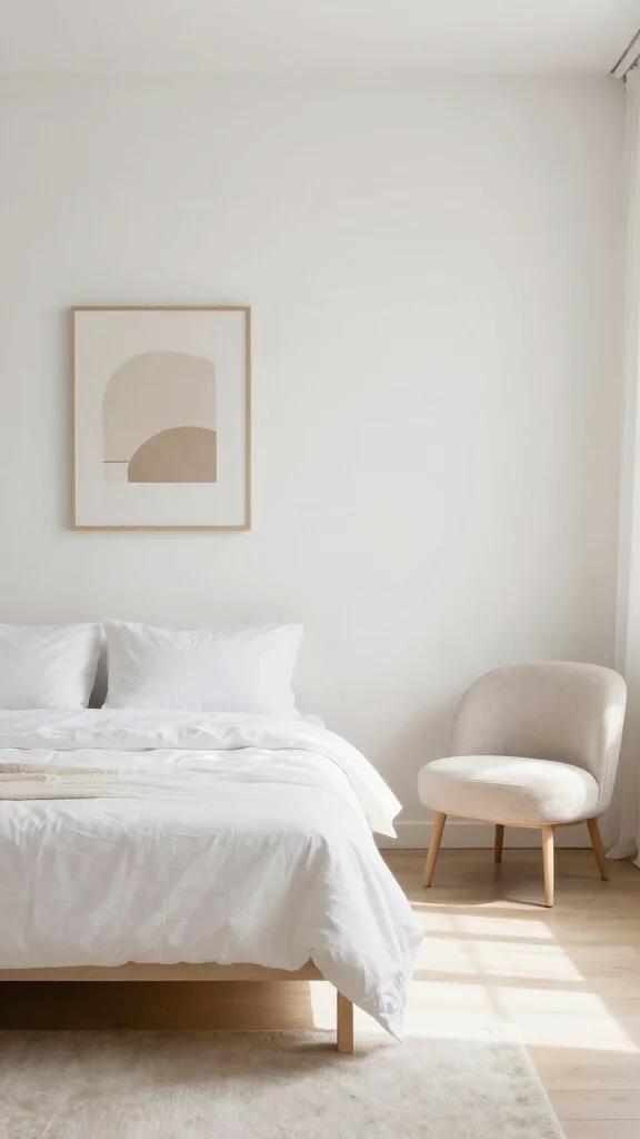 Keep decor simple: a single piece of art, a plant, and a couple of personal touches, all coordinated in a cohesive color palette for a calm, minimalist charm.