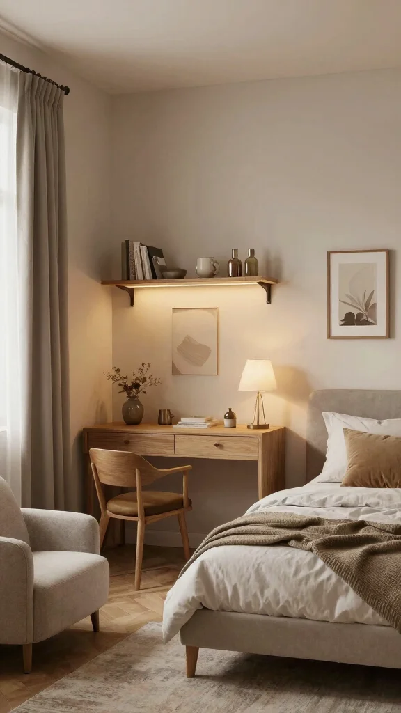 Create a welcoming atmosphere by combining comfort with clean design. Start with a soft base of cozy small bedroom inspiration—think warm textiles, a plush rug, and layered lighting with a dimmable lamp.