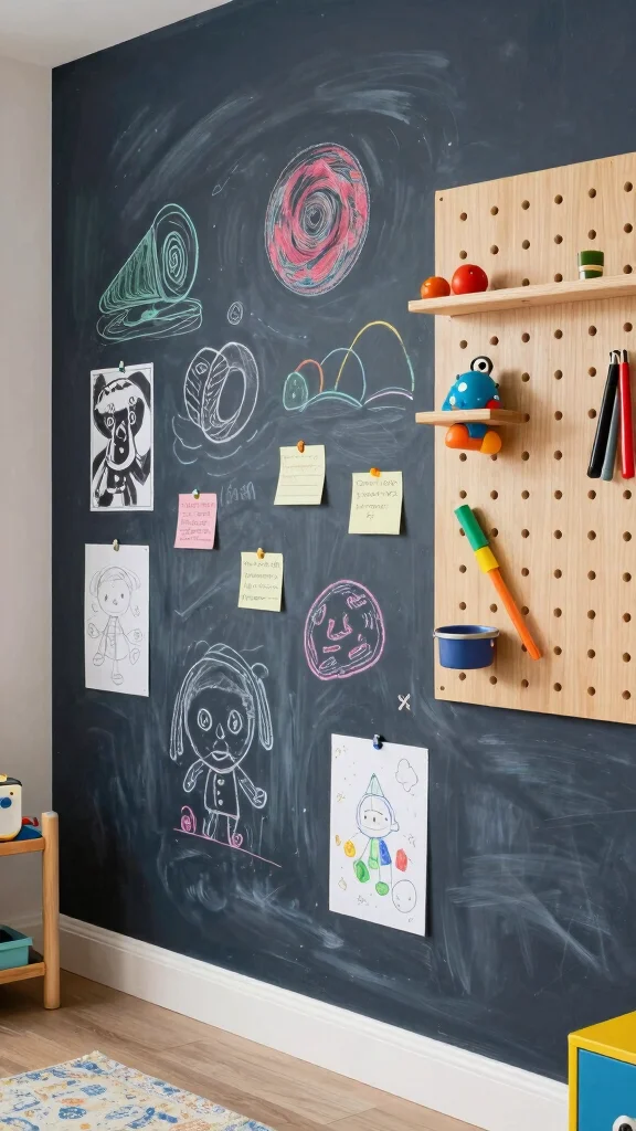 Fun fact: kids spend up to 30 minutes a day doodling and rearranging their space. A chalkboard wall or magnetic board turns this energy into clean, creative play and easy updates. Pair it with DIY pegboards to keep art supplies ready for the next inspired moment.