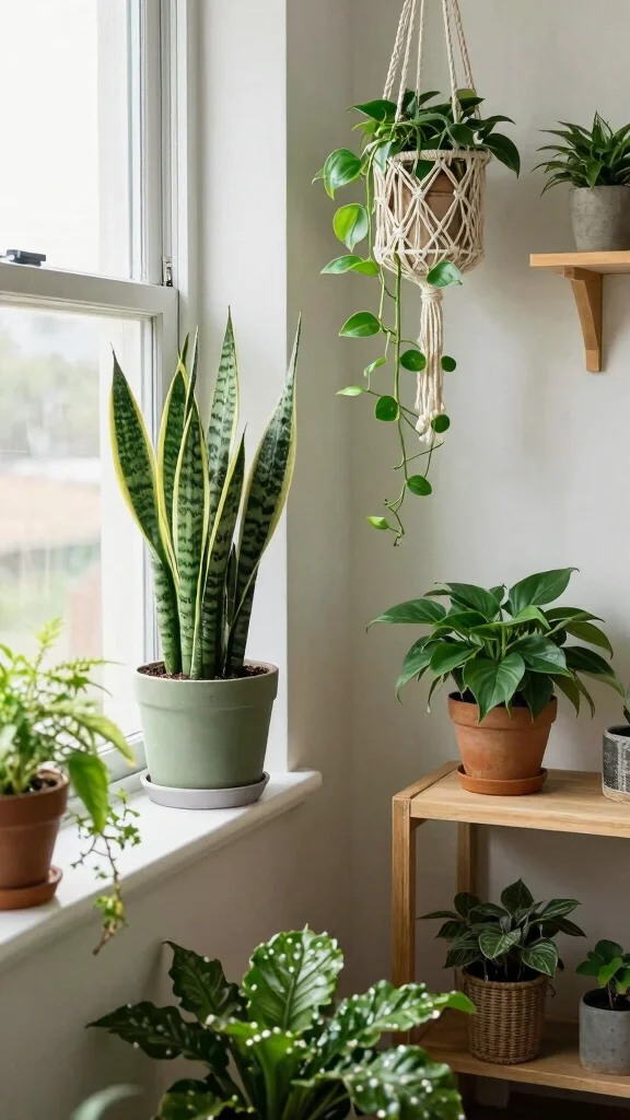 – Use snake plants for low light and air purification.