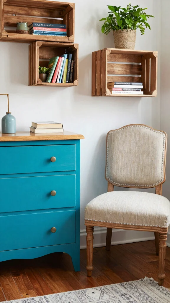 – Transform wooden crates into functional shelving.