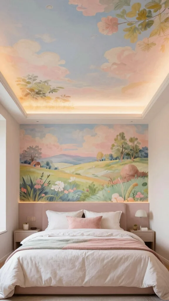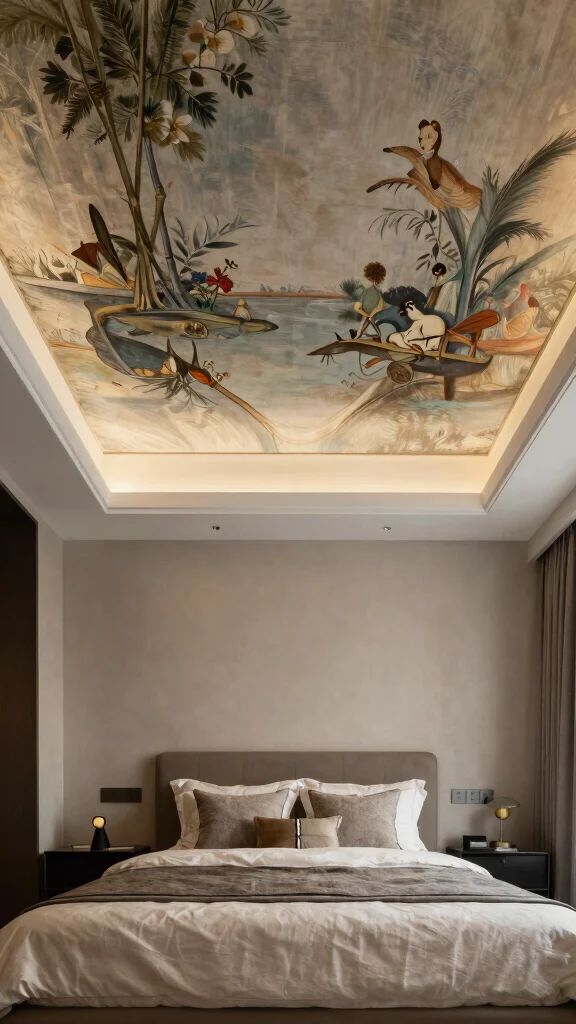 Choose artwork that complements the room’s decor while adding a personal touch. This technique encourages vibrant colors and creativity, making the ceiling a true statement piece. Pair with minimal furniture to keep the focus on the artwork, ensuring a cohesive design.