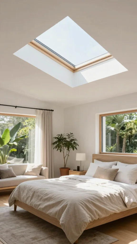 Strategically positioned skylights can provide optimal light exposure while maintaining privacy. This design pairs beautifully with soft color palettes and organic textures, reinforcing a calming atmosphere. Consider using blackout shades for restful sleep at night.