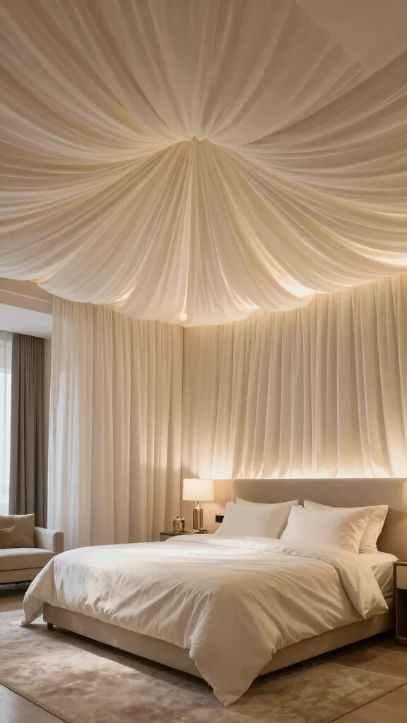 Luxurious fabrics can elevate tray ceiling ideas bedroom master suite. Draped silk or velvet panels add softness and texture, turning a high ceiling into a cozy focal point—perfect for plush bedding and understated elegance.