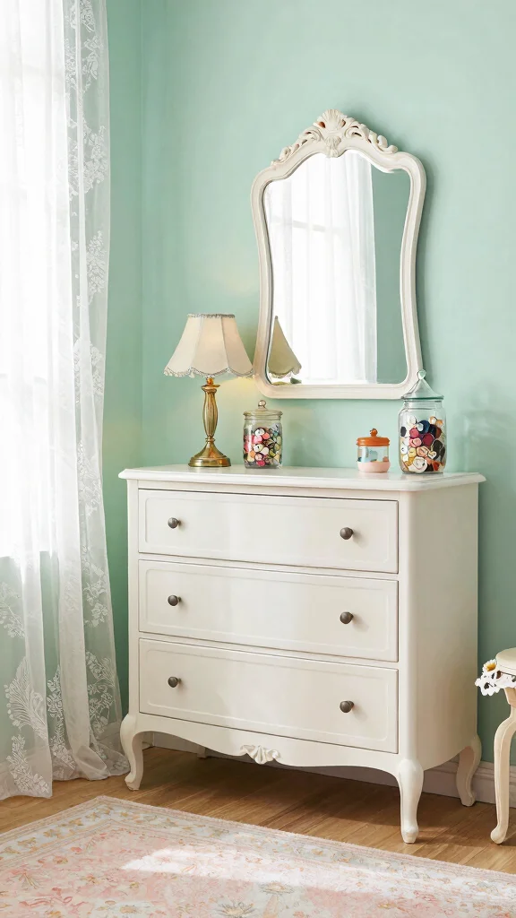 For a practical approach, consider painting your walls in a soothing pastel shade to establish a calming backdrop. Add vintage accessories like lace curtains, glass jars filled with buttons, and antique jewelry boxes to complete the look while keeping it budget-friendly and personal.