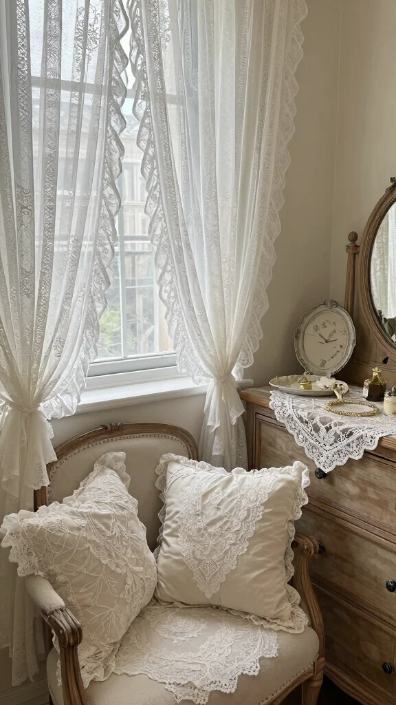 Consider using lace curtains to soften incoming light, or add throw pillows with lace detailing for extra comfort. Vintage lace doilies can contrast beautifully on a rustic table or dresser, showcasing your decor elegantly.