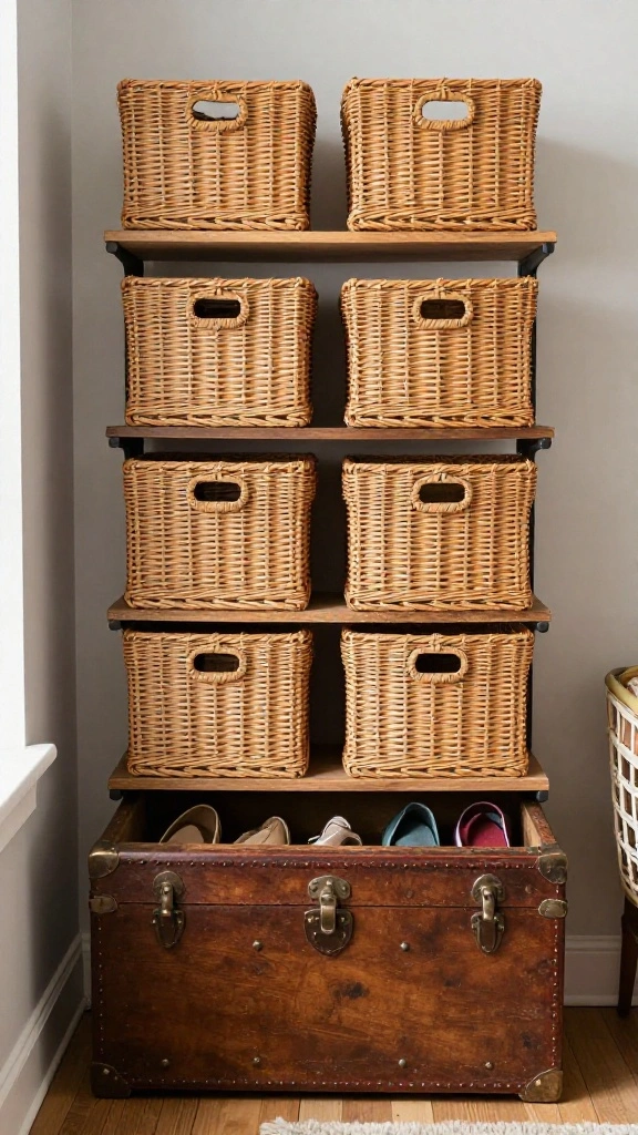 Wicker baskets for accessories or an antique trunk for blankets can add character to your space. You might also repurpose items like old crates as shelving for shoes or books.