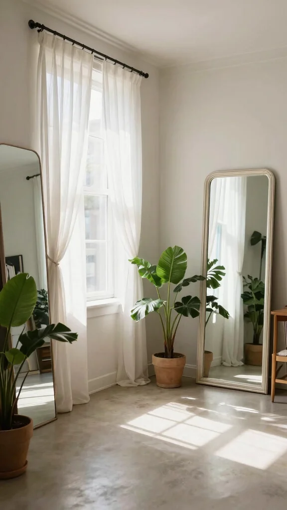 Consider hanging a large ornate mirror as a striking statement piece, using a frame that complements your decor style. You might also create a gallery wall of smaller mirrors in various shapes and sizes to reflect light and create an airy ambiance.