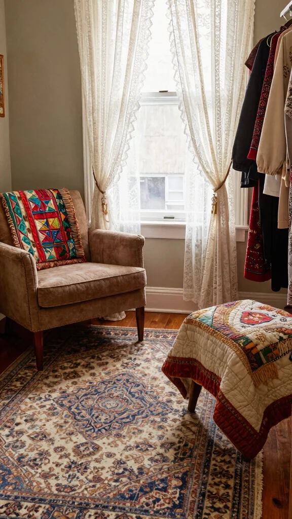 Utilize vintage textiles creatively: drape a patterned fabric over a stool, cover an armchair with a vintage quilt, or hang lace curtains to soften incoming light. Mix and match patterns for an eclectic vibe or stick to a cohesive color palette for a polished look.