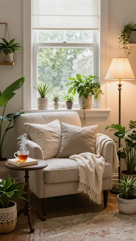 Choose a well-lit area for your cozy nook, ideally with a view. Add a small side table for your cup of tea or a favorite book, and don’t forget a soft throw blanket or vintage-style pillow for added comfort.