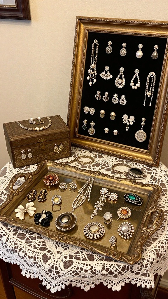 Utilize vintage jewelry boxes, ornate trays, or framed display boards to keep your pieces visible. Antique dressers with glass-top drawers can elegantly organize your jewelry, creating a curated look that sparkles in your room.