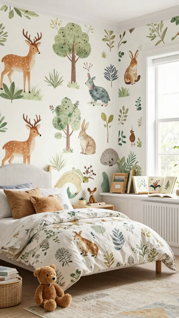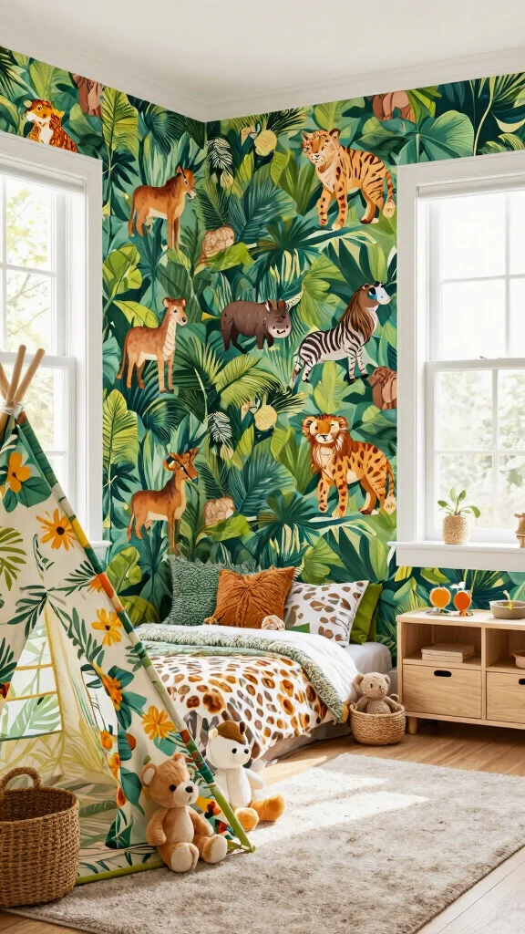 Choose eco-friendly patterns featuring friendly animals like elephants and lions to cultivate curiosity. Pair this wallpaper with animal-themed decor and toys for a cohesive and playful look.