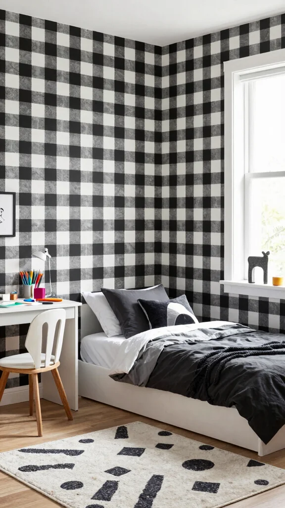 Did you know checker-patterned wallpaper can elevate a room with just two colors? Eco-friendly options keep wallpaper for kids bedroom safe, and pairing the pattern with solid furniture makes the checker pop.