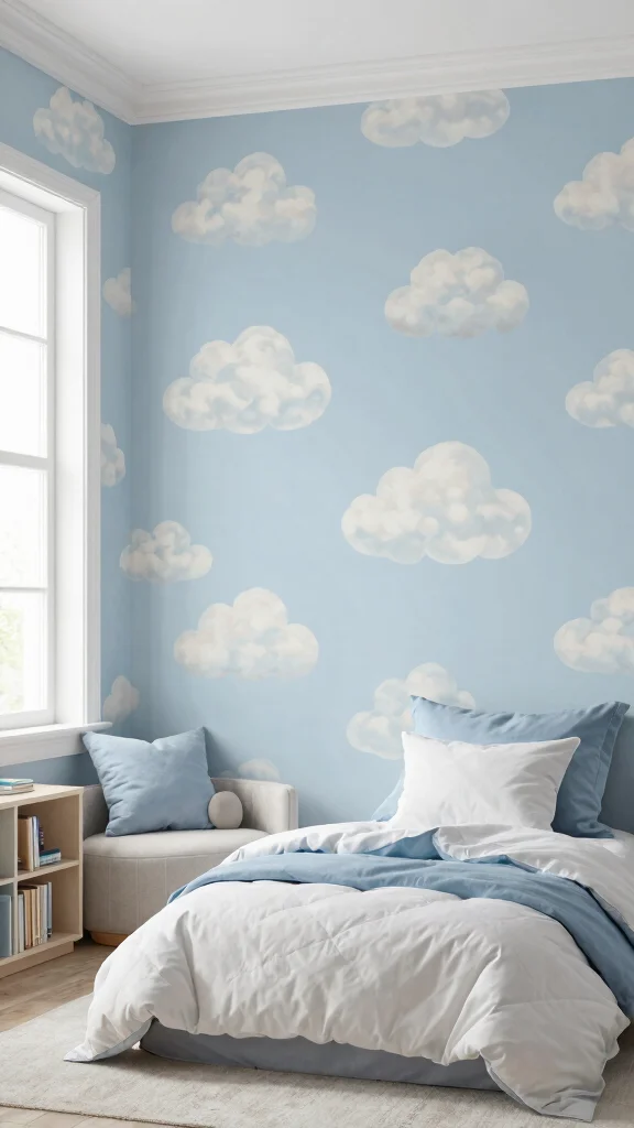Pair it with soft blue and white bedding to achieve a cohesive look. This soothing backdrop can inspire dreams of flying above the clouds, encouraging a sense of calm and wonder.