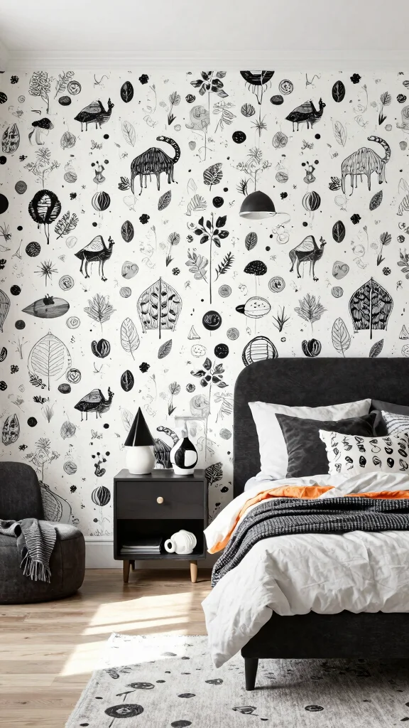Balance bold creative wallpaper patterns with calmer accessories and furniture, and repeat color accents in bedding, rugs, and curtains to reinforce the look without overwhelming the space.